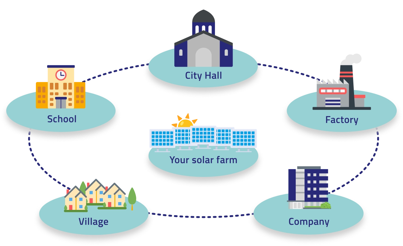 ACC enables your solar power plant to share its electricity with a group of nearby consumers, via the existing public grid – without any additional work.
